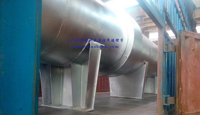 操作人員在換熱器設(shè)備上打上三門峽昊博化工工程有限公司標(biāo)示和電話0398-2918156
